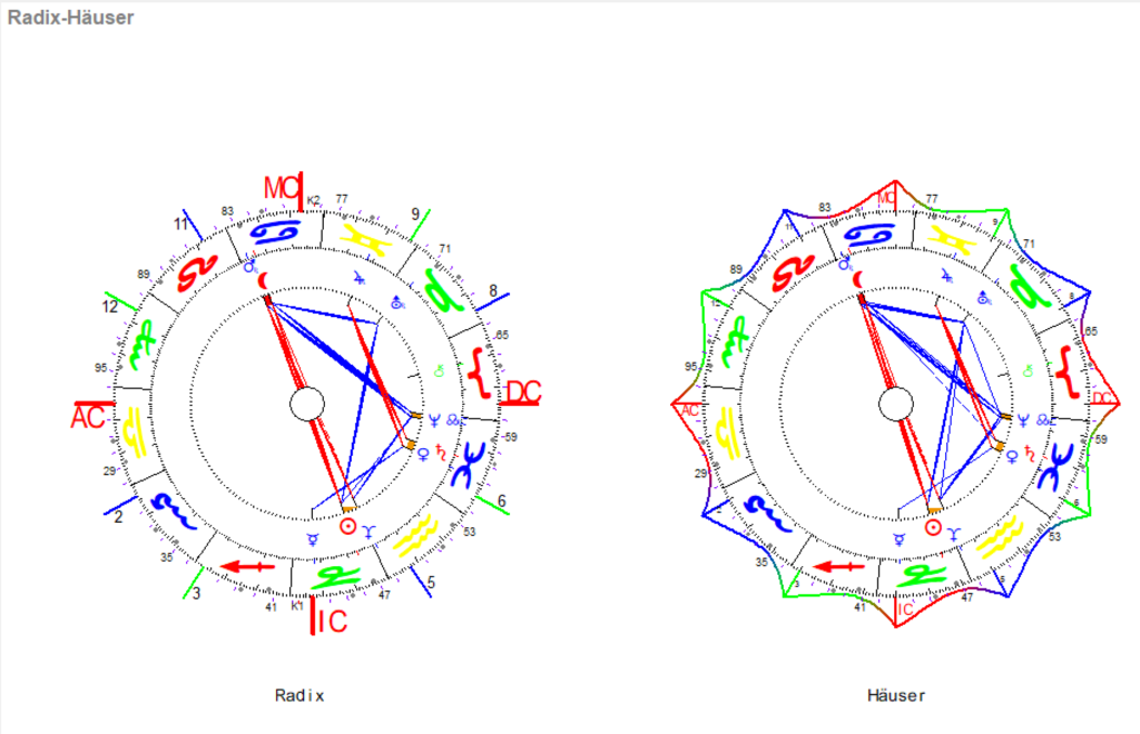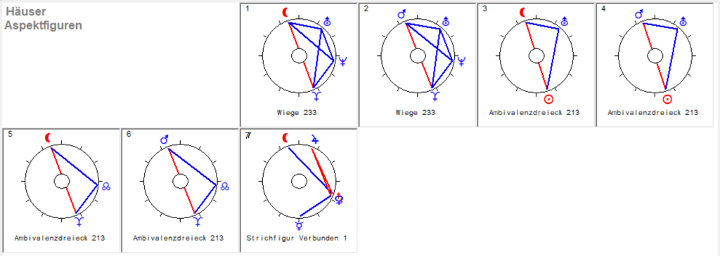 Ein gestricheltes sehr latentes Trigon vom Mond zu Saturn ist neu und das Sextil von Uranus zu Neptun. Uranus hat hier auch noch ein Trigon zu Pluto, was im Häuserhoroskop das kleine Talentdreieck zwischen den drei geistigen Planeten nochmals zurückholt.