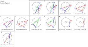 Das Aspekt-Bild ist veränderlich-kardinal und nicht kohärent. Die Richtung ist überwiegend diagonal mit senkrechten Anteilen. Es liegt auf dem 4. Strahl (Harmonie durch Konflikt) und hat den Schwerpunkt auf der DU Seite. Jupiter-Merkur Quadrat ist losgelöst.