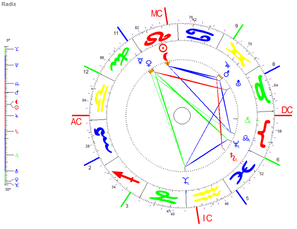 Saturn ist im Quadrat mit Mars und Jupiter losgelöst inneren Kämpfen ausgesetzt, Beziehungen und Gesellschaft sind in Auseinandersetzungen verwickelt. Hier zeigt sich keine direkte Lösung, aber Durchhaltefähigkeit mit Weitblick sind für sich eine gute Chance.