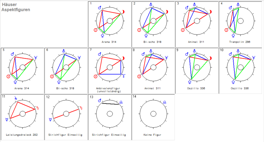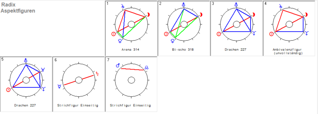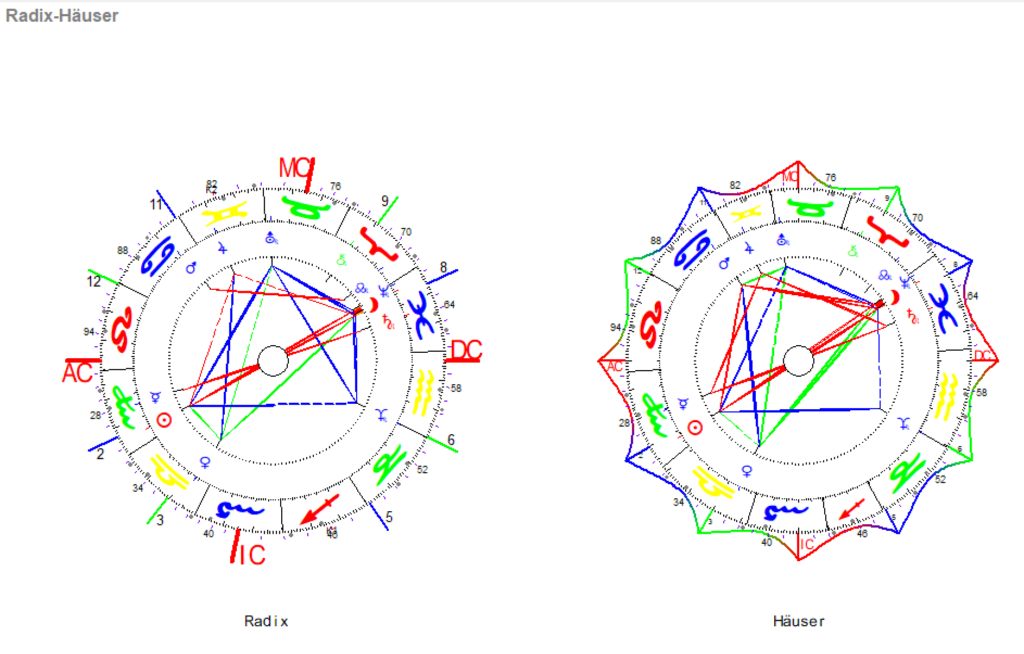 Wie erwähnt Sonne-Mond mit Uranus und Pluto siehe oben. Sonne in Haus zwei stark an der Spitze, nicht mehr so stark im Zeichen will sich behaupten.