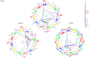 Die Zeichen-Haus-Verteilung ist dem oben beschriebenen Jahres-Horoskop sehr ähnlich: wieder Waage-AC ect. Das Solar-Jahr ist also auf Ausgeglichenheit (Waage-AC) und Standfestigkeit (Steinbock-IC mit Pluto und Zeichen-Herrscher Saturn) ausgerichtet.
