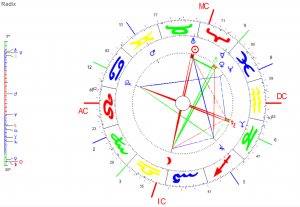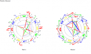 Ein Blick ins Häuser-Horoskop zeigt: nach außen ist unser Verhalten deutlich strukturierter, als es in der Radix aussieht. Da wir offenbar Ruhe bewahren, ausgeglichen und freundlich bleiben, steigen Wert und Beliebtheit.