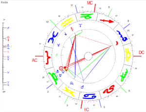 Die Persönlichkeitsplaneten -Sonne, Mond, Saturn – Rot im Bild- sind in ein Leistungsdreieck eingebunden. Das zeigt ein starkes ICH-Bewusstsein, was jedoch auch erschöpfen kann, Ruhe braucht.