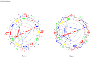 Die Radix des April Vollmondes zeigt sich veränderlich-kardinal mit einem fixen Auftrag. Das Haupt-Kreuz ist 1. Strahl (Kardinales Kreuz – Wille und Macht). Das Aspekt-Bild in fixer Zeichen-Betonung ist nicht kohärent. Die Konzentration finden wir beim ICH in den Häusern 10-3.