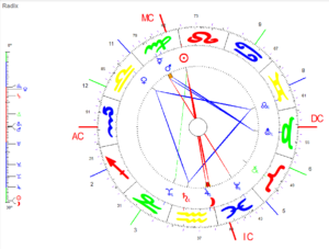 Merkur-Mars mit Neptun und Uranus: die vernünftige Denk- und Handelsstrategie von Jungfrau in Haus 10 wird manchmal durch Neptun verfälscht oder man macht sich Illusionen über Herkunft und Ziele. Uranus weiß es besser: er fordert Erneuerung aller Besitzstände, es geht um die Existenz.