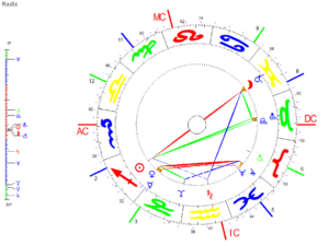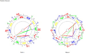 Schütze Sonne mit Zwillinge Mond/Mars im Ambivalenz-Dreieck mit Saturn und im Reiz-Dreieck mit Uranus/Mondknoten.