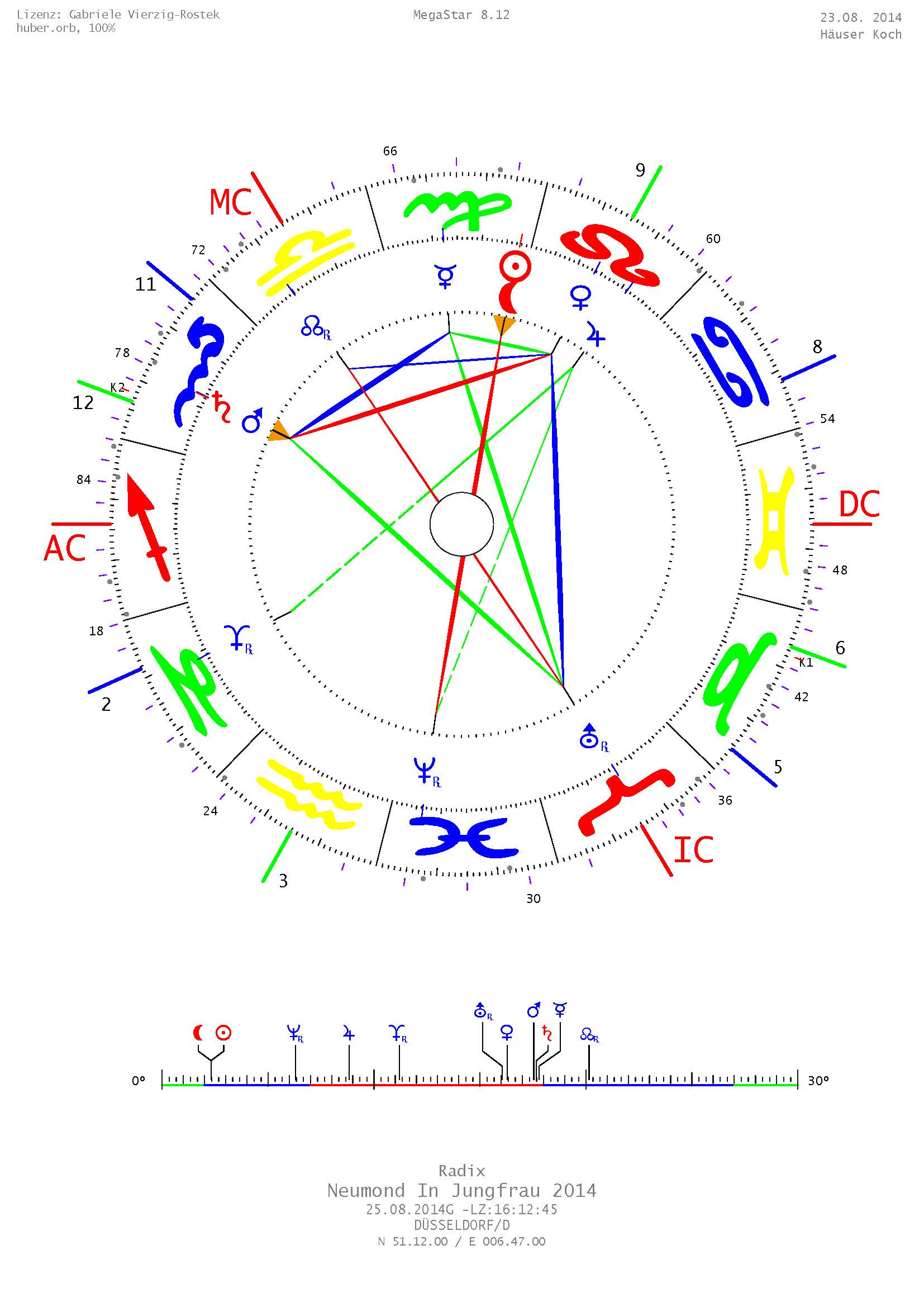 Die Zeichen an den Hauptachsen und an der 3/9 Achse, die auch besonders extrovertiert ist, sind Luft und Feuer, also offensiv und eher männlichen Aktivitäten zugeordnet. Die Neumond Konstellation ist mit Neptun in Fische eng verbunden (eine reife Opposition verhält sich ähnlich, wie eine Konjunktion), also ist Liebe, Verzeihen, Verstehen und geistig Wachsen das Thema und die Achse steht eingeschlossen, so dass die Impulse nach innen wirken und im Innern reifen können. Von Jupiter kommt eine zarte Annäherung an Neptun und an Pluto, also sind die Sinne ebenfalls auf das Thema gerichtet und obwohl Pluto auf Disziplin achtet, richten sich die Sinne auch auf ihn. Unsere Fähigkeiten sollen durch geistige Reife wachsen.