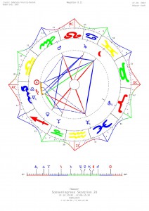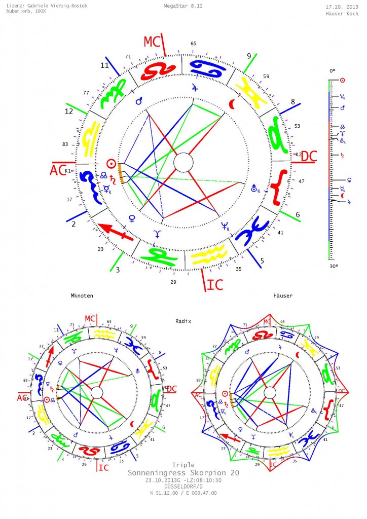 Das Bild liegt auf dem 7. Strahl (Zeremonielle Magie, Rythmus und Ordnung). Neubeginn bei K1 direkt nach dem AC. Viele verschiedene Motivationen sind enthalten, es wird ein spannender Monat. Selbstbewusstsein und Selbstwert verbinden sich unter logischen Konsequenzen, das innere Gewissen siegt und weist Höflichkeitsfloskeln zurück. Die Ausstrahlung ist harmonisch mit kämpferisch-emotionalem Unterton. Der Waage AC verlangt noch Ausgleich, doch im Skorpion entfalten sich innere Kämpfe, die evtl. zu harten Konsequenzen führen können, wenn man sich durch Illusionen oder falsches Verhalten isoliert hat. Es ist aber auch eine stärkere Erfolgsbilanz möglich, weil sich Unterstützung von Außen günstig auf das ICH auswirken kann, man muss es zu nutzen wissen und „richtig“ verstehen. („richtig“ ist individuell und keine Wertung!)