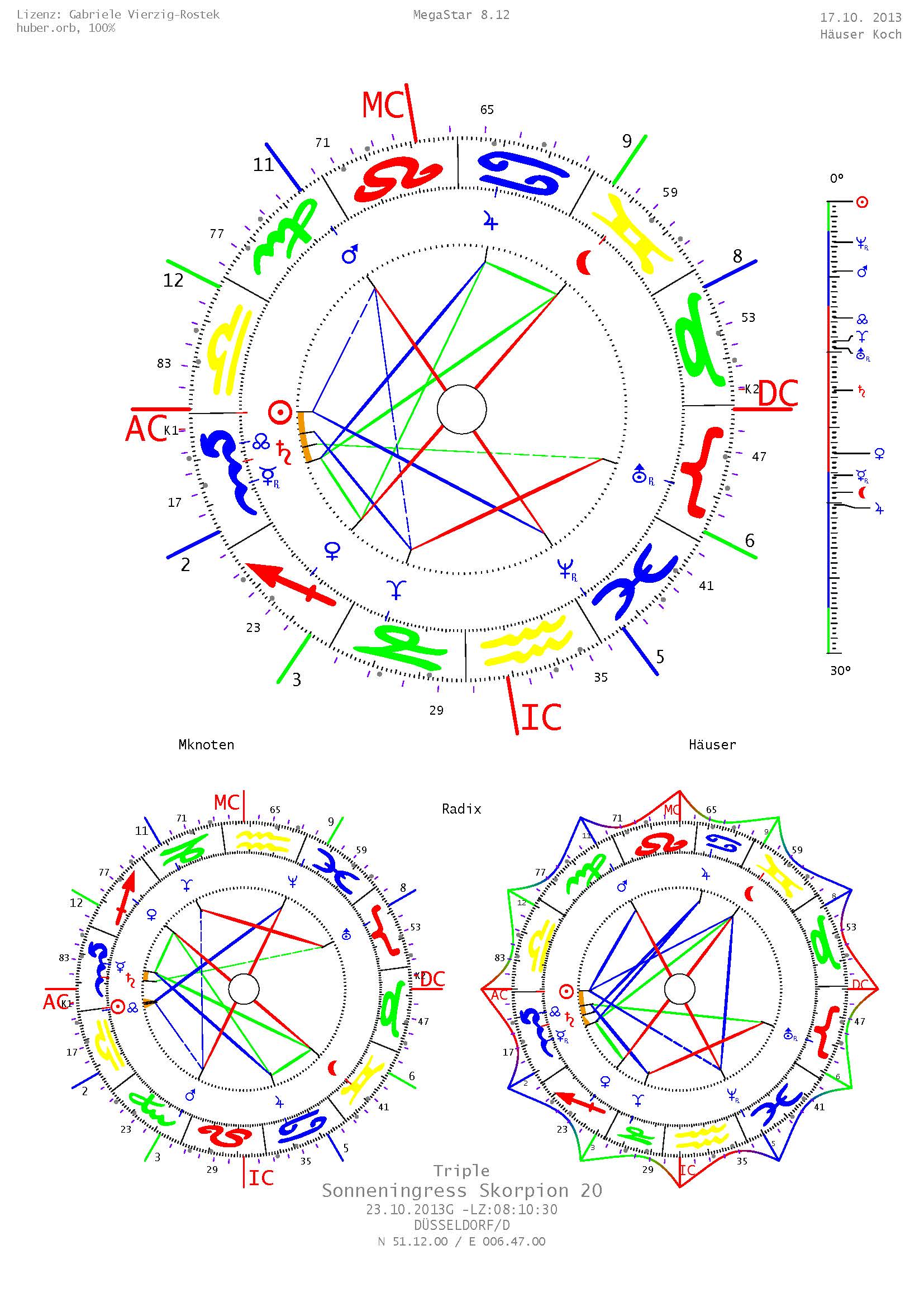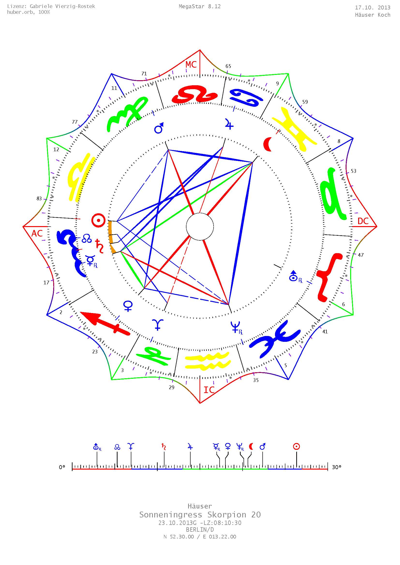 In der Ausrechnung für Berlin, wo die Koalitionsverhandlungen laufen, ist das Bild im Häuserhoroskop deutlich stabiler, substanzieller, rechtschaffener. Das Volk wünscht sich die stabile große Koalition. Der Skorpion AC dort stellt das Bild auf den 3. Strahl (Aktive Intelligenz) und sorgt für emotional-intensive Auseinandersetzungen unter den Verhandlungspartnern, der Wille zu konstruktiven Ergebnissen ist vorhanden. Die Regierung lässt sich auf ungeliebte Zusammenschlüsse ein, der Staat will sicher regiert und stark aufgestellt werden, auf persönliche Befindlichkeiten Einzelner kommt es da nicht an. Aufbruchstimmung geht verloren. Der innere Anspruch an Gewissenhaftigkeit mit ausgleichender Gerechtigkeit ist durch alle Instanzen spürbar.