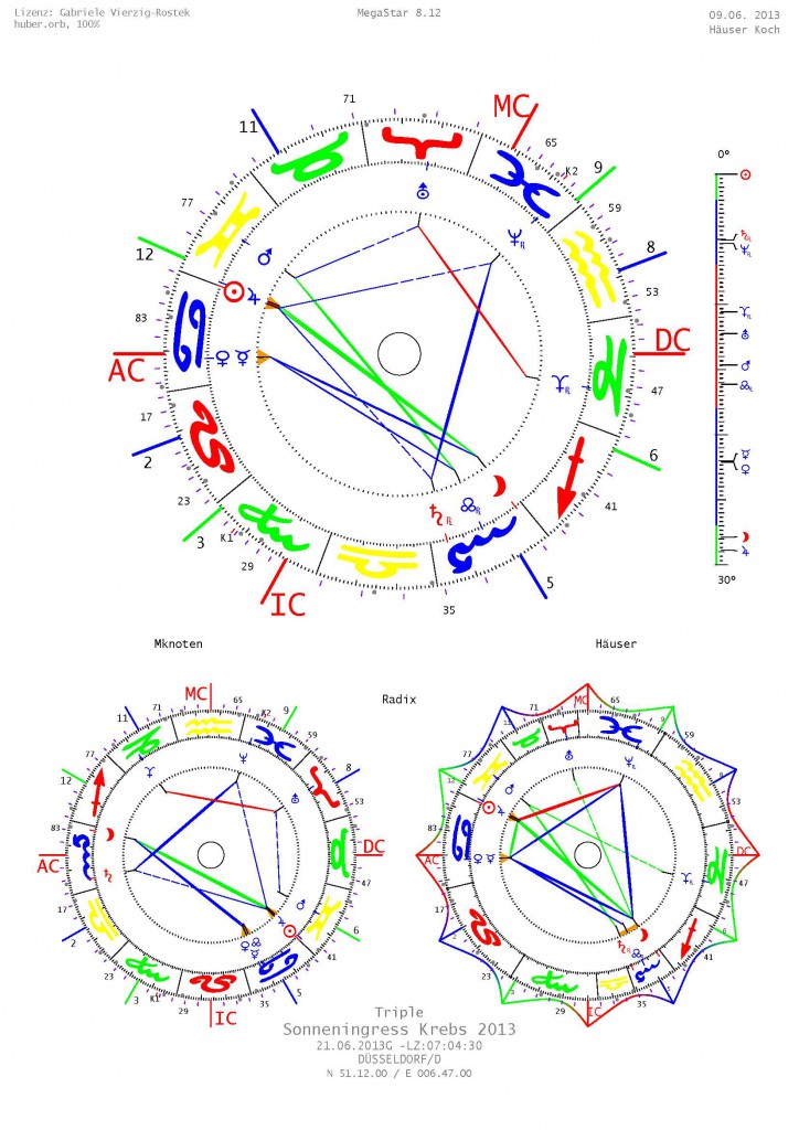 Da zwei wichtige Zielrichtungen (AC Krebs und MC Fische) in Wasserzeichen stehen, geht es um Gefühle, die erfahren, durchlebt und verarbeitet werden sollen. Außerdem stehen alle drei Persönlichkeitsplaneten ebenfalls in Wasserzeichen (Sonne nun Krebs, Saturn und Mond in Skorpion)! In unserer Gesellschaft wird den Gefühlen immer noch ein viel zu geringer Stellenwert beigemessen, dabei steuern sie die wichtigsten Vitalfunktionen und unser emotionales Gedächtnis funktioniert „im Schlaf“! Dieser Monat wird hier vielleicht etwas verändern, denn wir wollen unsere Gefühle zeigen und ein inneres Bedürfnis nach Geborgenheit und Aufgehobensein im Kreis lieb gewonnener Menschen (Krebs Sonne und AC mit Merkur-Venus Konjunktion) ist deutlich sichtbar, eine gewisse Rückzugszendenz ebenfalls. (Jupiter-Sonne in 12)