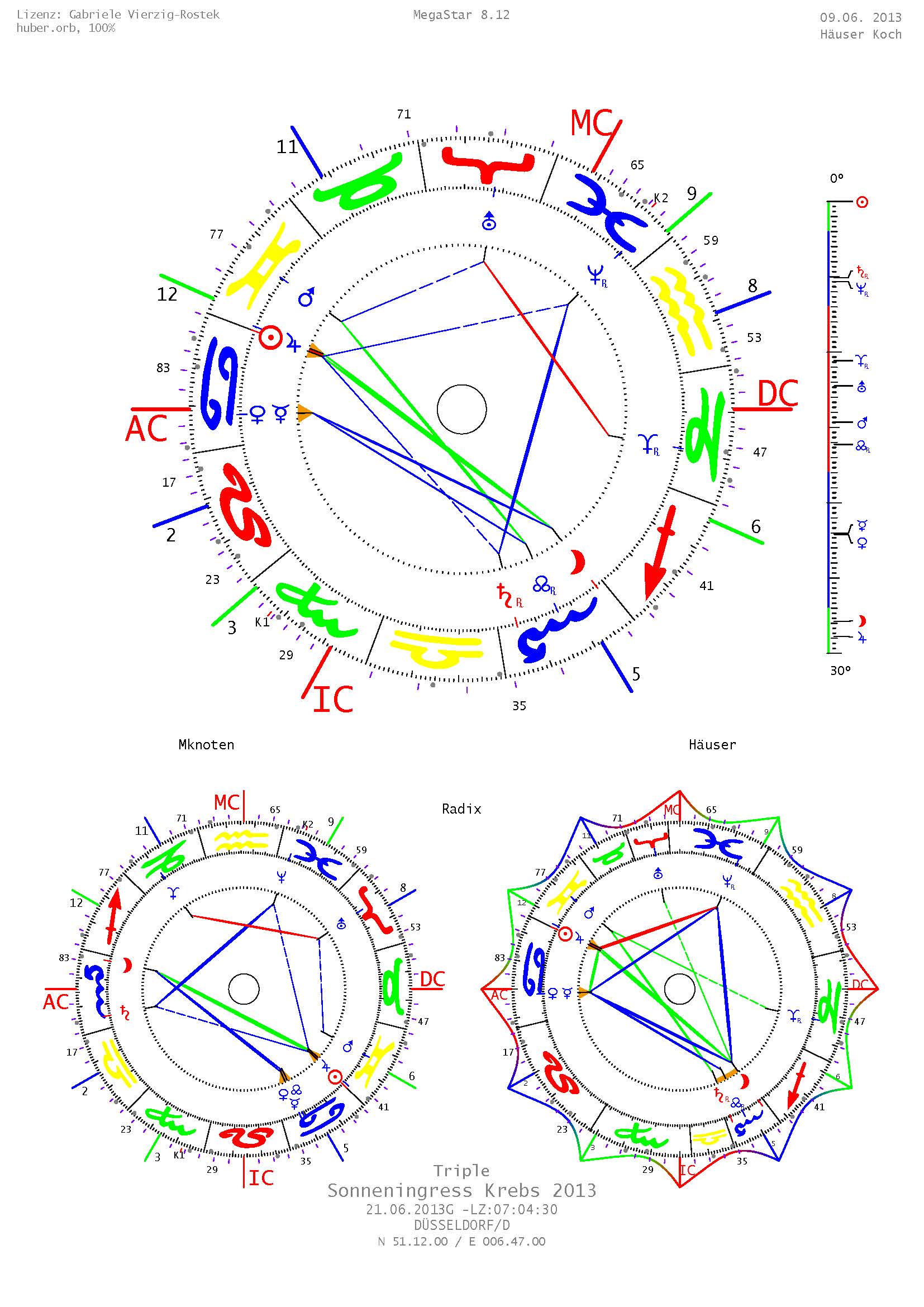 Da zwei wichtige Zielrichtungen (AC Krebs und MC Fische) in Wasserzeichen stehen, geht es um Gefühle, die erfahren, durchlebt und verarbeitet werden sollen. Außerdem stehen alle drei Persönlichkeitsplaneten ebenfalls in Wasserzeichen (Sonne nun Krebs, Saturn und Mond in Skorpion)! In unserer Gesellschaft wird den Gefühlen immer noch ein viel zu geringer Stellenwert beigemessen, dabei steuern sie die wichtigsten Vitalfunktionen und unser emotionales Gedächtnis funktioniert „im Schlaf“! Dieser Monat wird hier vielleicht etwas verändern, denn wir wollen unsere Gefühle zeigen und ein inneres Bedürfnis nach Geborgenheit und Aufgehobensein im Kreis lieb gewonnener Menschen (Krebs Sonne und AC mit Merkur-Venus Konjunktion) ist deutlich sichtbar, eine gewisse Rückzugszendenz ebenfalls. (Jupiter-Sonne in 12).