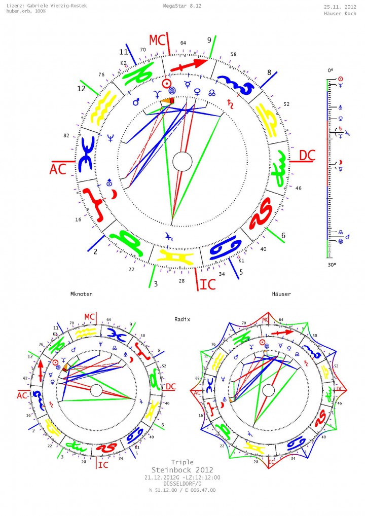Das Aspektbild ist senkrecht (Ziele und Eigenverantwortung erreichen) und sehr kardinal mit einer veränderlichen Figur (energischer Wille, Kontakte und Komunikation). Einige Diagonale deuten auf die Suche nach Stabilität, Lösungen sollen gefunden werden. Mit allen drei Farben sind Entwicklungen, Erkenntnisse und Kompromissbereitschaft vorhanden. Der Wille ist stark und manchmal auch stur, Wünsche und Erwartungshaltungen werden manchmal enttäuscht (Mond in Widder eingeschlossen). Verantwortungsbewusstsein ist groß geschrieben (Sonne-Pluto im 10. Haus, Steinbock). Das ist auch gleich die wichtigste Aufgabe, denn der innerste Kern des Universums, das Galaktische Zentrum ist ebenfalls in Konjunktion mit Pluto/Sonne! Analog zum innersten Wesenskern des Menschen ist also das wichtigste Ziel für uns Menschen, diese Aufgabe ernst zu nehmen. Neptun im Sextil zu Sonne steuert Einfühlungsvermögen bei und erinnert daran, das der Mensch ein spirituelles Wesen ist. Vorsicht vor „Schönfärberei“!