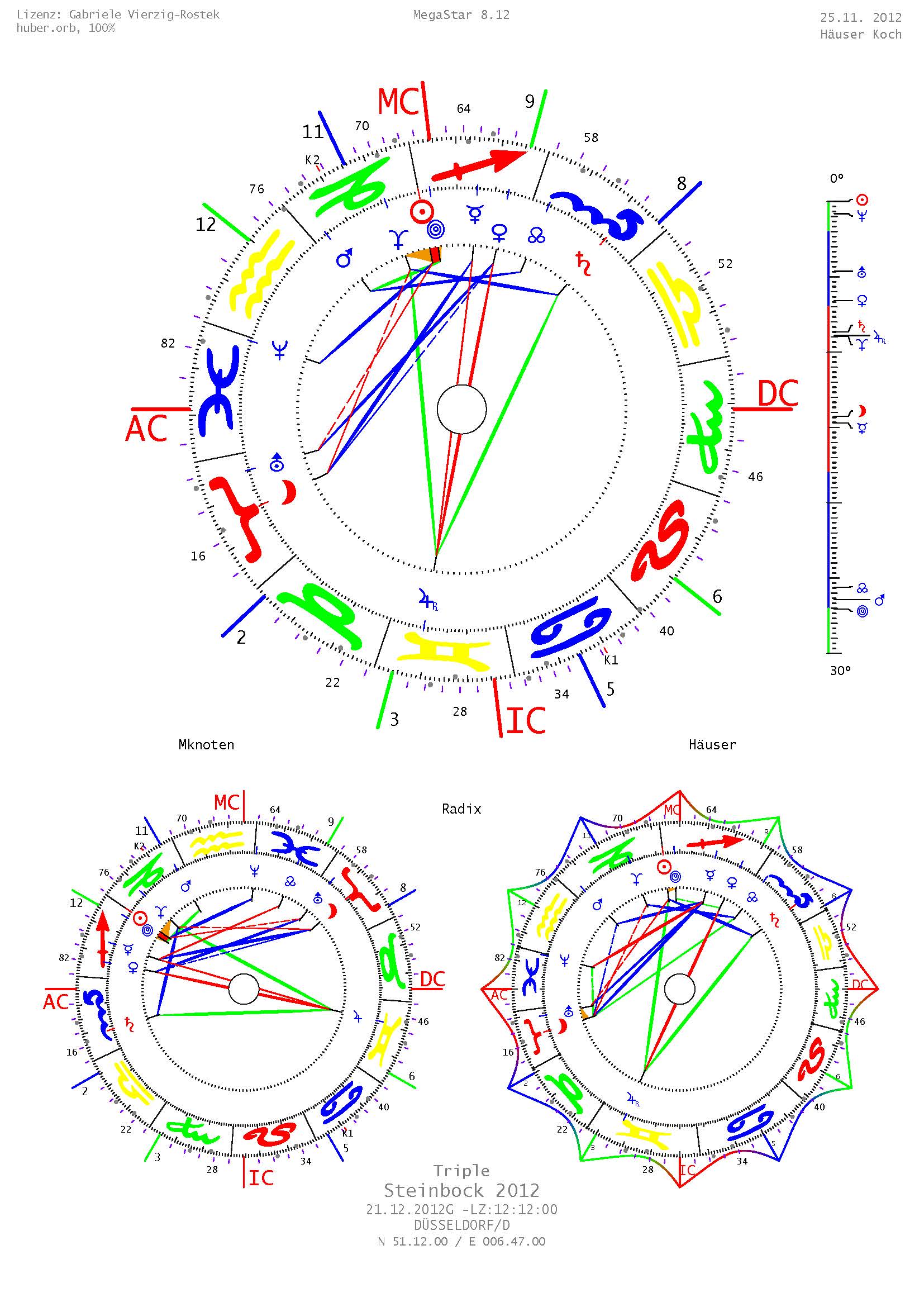 Im Mondknotenhoroskop (Unbewusstes!) sind wir alle auf Kontakt und Kommunikation eingestellt. Begegungen, sich vergleichen, die Konkurrenz ausloten und aus allem lernen ist unbewusste Motivation. Mit einem fast kindlichen inneren Anspruch existieren hohe Erwartungen an Versorgungsleistungen, gleichzeitig ist da eine innere Abwehr, was Veränderungen betrifft. Mars steht hier abgelöst, Saturn in 1 zögert, daher zeigt sich eine innere Blockade, man bewegt sich nicht vorwärts, verharrt evtl. in einer Art „Status Quo“. Unbewusst werden Anforderungen als von außen kommend bzw. als Zumutung empfunden…