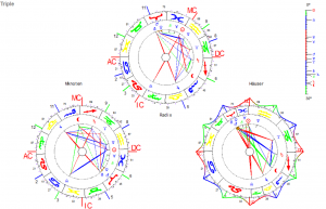 Die weitere auch bei Unruhe bestehen bleibende Verbindung ist Pluto-Mars-Merkur. Diese wäre dann aber ambivalent (nur blau-rot). Kämpferisches Auftreten mit schönen Worten verkleiden um Macht auszuüben? Oder kluge Worte nutzen, um notwendige Gewissensentscheidungen durchzusetzen? Es gibt immer verschiedene Wege zum Ziel!