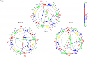 Das kardinal-veränderliche Aspekt-Bild liegt auf dem 3. Strahl (Aktive Intelligenz) mit AC in Skorpion und MC in Löwe. Die Farbigkeit zeigt die Sehnsucht nach Konflikt-Freiheit.
