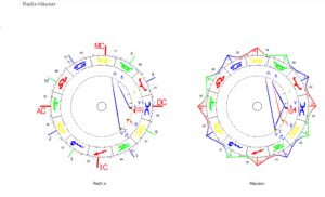 Im Häuser Horoskop verbinden sich Saturn-Merkur mit Uranus im Quadrat. Freiheit setzt sich mit Zwang auseinander. Neptun bekommt Verbindung zu Venus-Mars-Pluto.