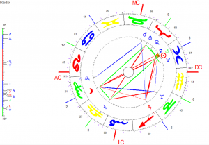 Mond nimmt schnell auf, was über Gerechtigkeitsempfinden und Sinn-Suche (verlangsamt durch Jupiter R) im Umlauf ist, sein Gewissen ist auf konkrete Ziele gerichtet aber er ist etwas überfordert durch zu viele Einflüsse und Informationen (rot-grün). Die Gesellschaft ist in Aufruhr, Chaos ist an vielen Enden spürbar.