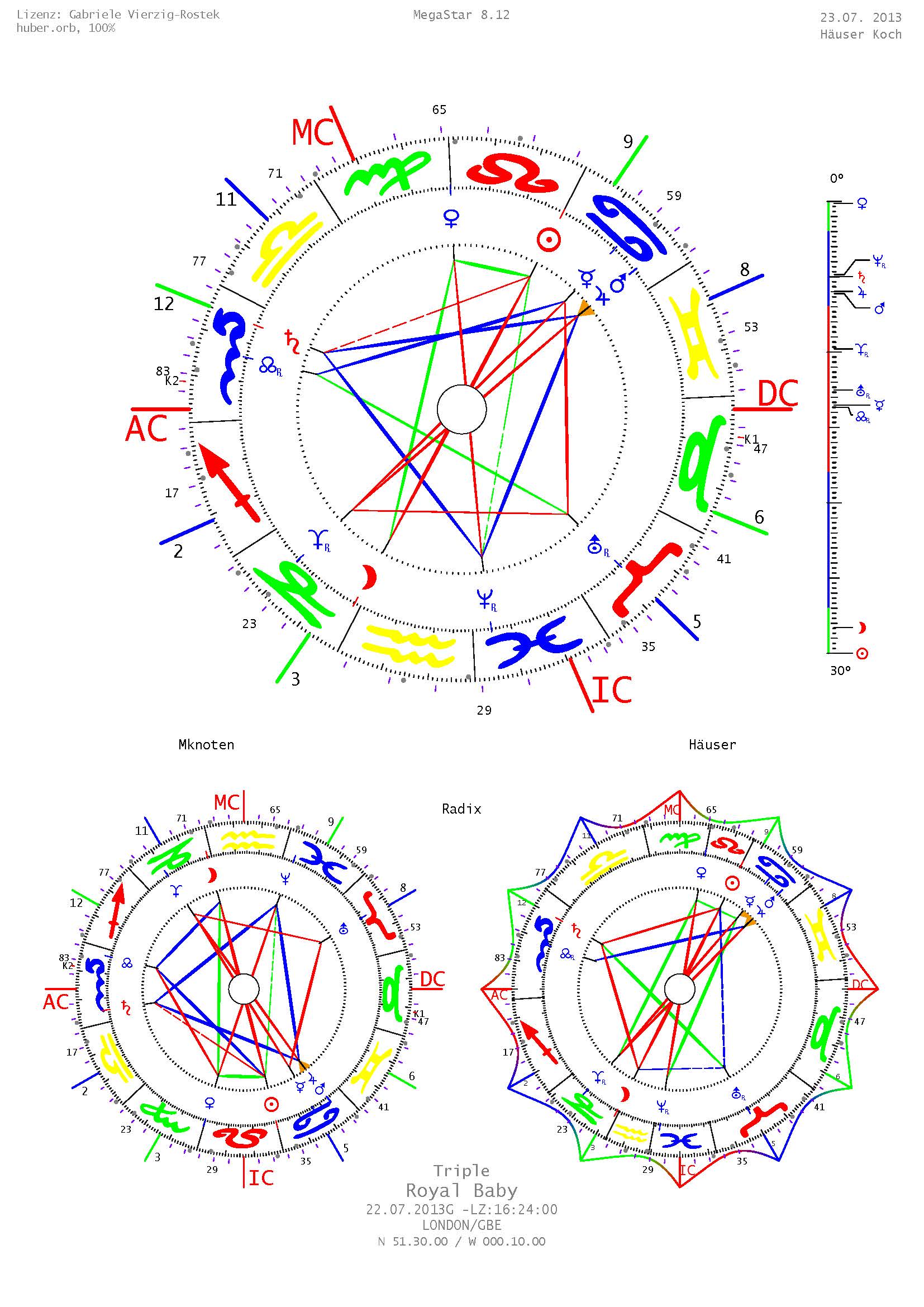 Viele Möglichkeiten sind in diesem Bild enthalten, die zu erfüllen länger dauern dürfte. Der 5. Strahl beherrscht die Energie (konkretes Wissen). Seine innere Unruhe könnte er mit einem gewissen Ernst beherrschen, was dem Steinbock-Mond entspricht. Bewunderung für seinen Vater könnte sein Antrieb werden (später), er wird lernen müssen, den Forderungen des Königshauses zu entsprechen, dann kann er in dem Rahmen seine Ideale verwirklichen. Sonne in 9 steht gut, aber an der Zeichengrenze hat sie keine Energie und es ist zu vermuten, dass er seinen Jupiter als Sonne-Unterstützer benutzen wird. Diese joviale Austrahlung wird ihm Beliebtheit in der Gesellschaft einbringen. Einfühlsamkeit mit Tatkraft, Verständnis für die Nöte der Menschen und sorgsames Abwägen bei einem Rückzug in die Natur, so stelle ich mir diesen Menschen als Erwachsenen vor, für einen echten Regenten gute Voraussetzungen. Er braucht regelmäßige Rückzugsphasen, um sich zu regenerieren und intensiv über seine Aufgaben und Pflichten nachdenken zu können Seine Ur-Großmutter „Die Queen“, wird von Anfang an Einfluss auf sein Denken nehmen, seine Beziehungen diktieren und wird ihm die Gelegenheiten immer wieder geben, sich zu einer Autorität zu entwickeln, die irgendwann sagen kann: „Krieger bin ich und aus dem Kampf gehe ich siegreich hervor“. (Der Kampf des Ego gegen das Selbst ist hier gemeint. Skorpion enthält immer einen Transformationsauftrag). Vielleicht ist dieser Junge aber zunächst einfach ein wenig rebellisch und versucht, seinen Willen durchzusetzen… Saturn in 12 zeigt eine innere Distanz und Stabilität, aber er könnte sich auch überfordert fühlen, wenn er äußere Einflüsse ungefiltert zu dicht an sich heran lässt. Der „Sicherheitsbeauftrage“ wird erst spät aktiviert…, eine pessimistische Abwehrhaltung könnte auch manchmal daraus resultieren, sie dient dem Selbstschutz.