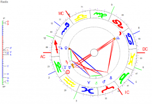 Das Aspekt-Bild des Januar Vollmond 2019 liegt auf dem 6. Strahl (Hingabe und Idealismus). Es ist inkohärent. Trotz eines kleinen Vierecks ist es recht dynamisch.