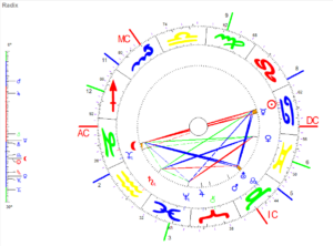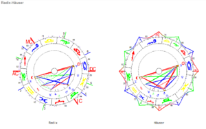 Das Häuser Horoskop wirkt wie eine Doppel-Pfeil-Spitze, der auf das Kollektiv gerichtet ist (Leistungsdreieck und kleines Talentdreieck, auf Uranus und Mondknoten gerichtet).