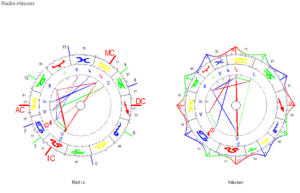 Im Häuser Horoskop sind weniger Linien, es wirkt klarer, ist aber nicht mehr kohärent. Zwei verschiedene Aufgaben stehen nebeneinander: das kleine Erkenntnisdreieck mit Sonne-Mond-Jupiter-Merkur entwickelt neue Eindrücke. Diese werden sich eher in inneren Lebenserfahrungen speichern.