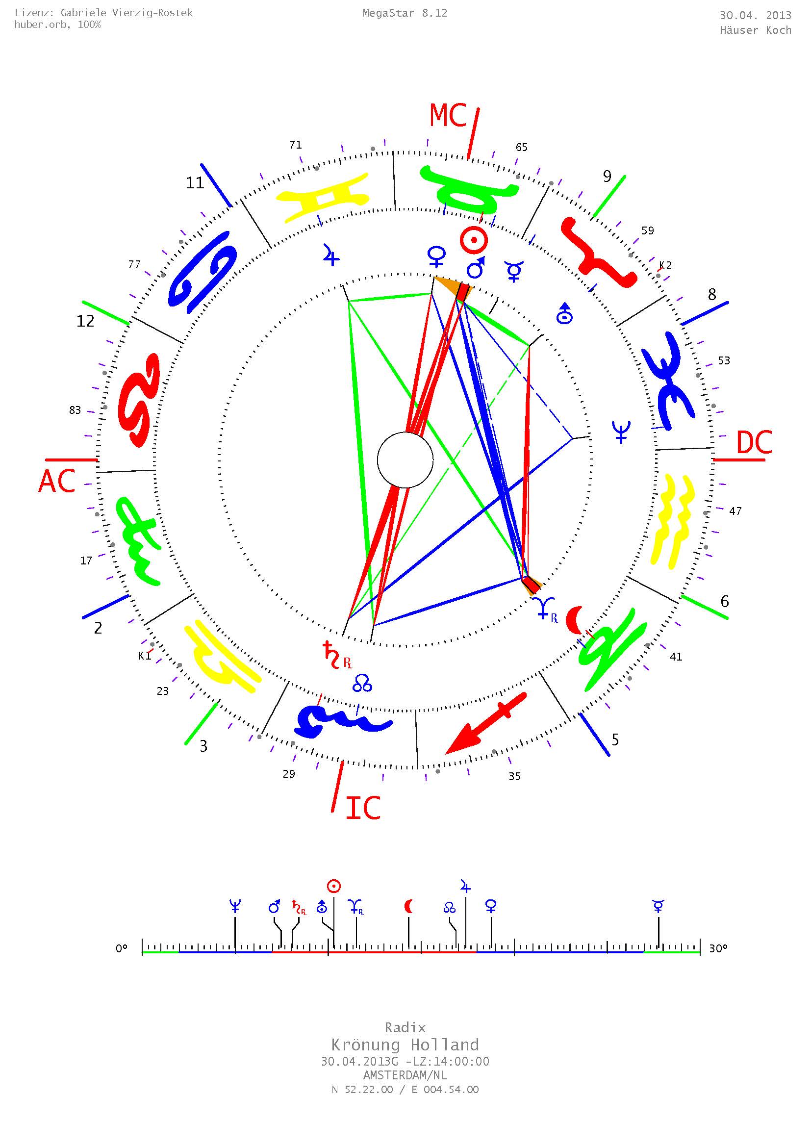 In Holland wird heute der seit sehr langer Zeit erste männliche König ins Amt gefeiert. Wir sehen ein strahlendes Königspaar (Sonne/Mars und Venus am MC in Stier). Die Opposition Sonne-Saturn zeigt innere Stabilität und Würde. Mond/Pluto in Steinbock in Haus 5 am Invertpunkt deutet auf eine starke, disziplinierte Haltung in allen Beziehungesfragen. Herzlichen Glückwunsch!