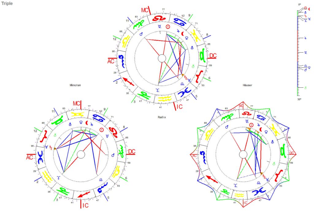 Die Hauptausrichtung geht zum Du in den unbewussten Beziehungs-, Kontakt und bewussten Denk-Bereich. Es fällt sofort ein losgelöstes Leistungsdreieck auf, welches von Mars, Venus und Mondknoten gebildet wird. Die Geschlechter bekommen Energie und sollen lernen sich miteinander durchzusetzen, nicht gegeneinander. Harmonie im Gespräch, Fleiß bei der Arbeit und die Aufforderung, in Beziehungen sanft zu bleiben. Beziehungen aller Art wohlgemerkt, nicht nur Liebesbeziehungen…