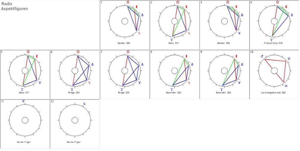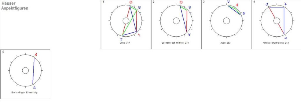 Die Aspekt Figur im Häuser Horoskop wird kleiner, weniger kompakt und besteht aus dem Deco-Viereck und Dreiecken sowie einer Strichfigur. Es wird kohärent, wir sind also ganzheitlicher im Verhalten. Leichter durchschaubar und interpretierbar.