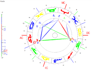 Löwe im 1. Haus hat besonders große Strahlkraft. Sonne-Mond und Merkur in Löwe wirken noch ins 2. Haus und lassen Talente und Fähigkeiten kreativ werden, die dann mit Jungfrau vernünftig eingebracht werden können.