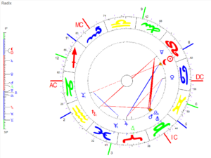 Im Löwe Neumond 2022 sehen wir eine Leistungsfigur und einige rote und blaue Willenslinien. Der Neumond im Schatten vor Haus 8 hat eine solche harmonische, aber auch „dickköpfige“ Verbindung zu Jupiter.