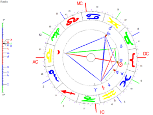 Mars und Mondknoten vervollständigen die Drachenfigur an der Hausspitze 9, stark in Zwillinge. Das Sendungsbewusstsein ist auf Unabhängigkeit gerichtet.