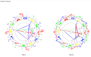 Unsere Befindlichkeit ist so doppelt betroffen, weil Venus (Wohlbefinden, Finanzen) beteiligt ist und Haus 6 mit vier Planeten plus Chiron auch die Gesundheit betreffen kann.