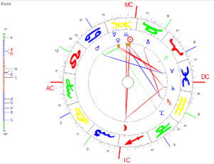 Die Persönlichkeitsplaneten Sonne und Mond sind mit Jupiter in ein Leistungsdreieck eingebunden. Das ICH sucht Erfolg im Außen. Jupiter signalisiert Empathie für die Mitmenschen und will gute Laune vermitteln.