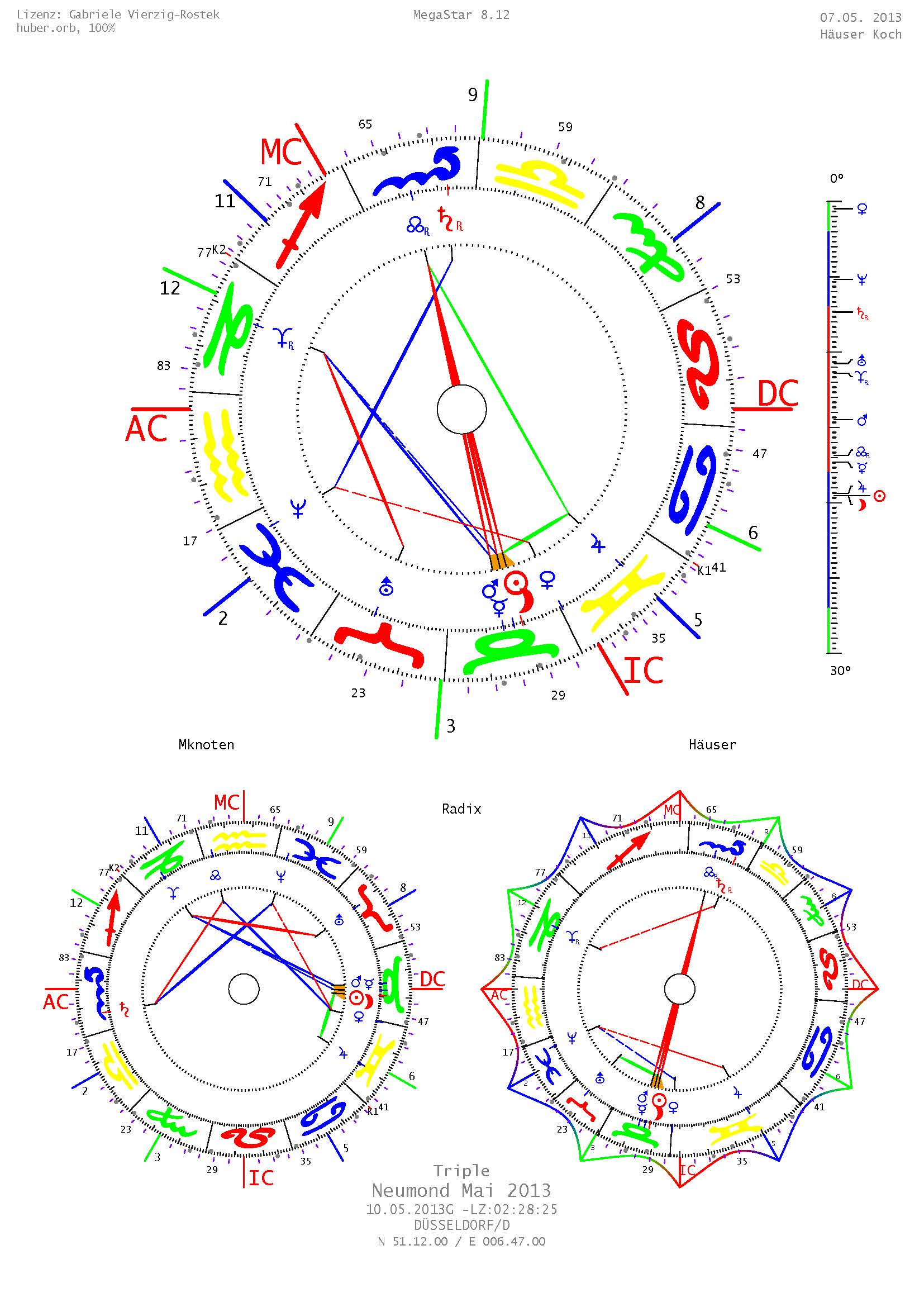 Die Besonderheit liegt in der Konjunktion von den vier Planeten Sonne (Geist-Denken), Mond (Gefühle-Emotionen), Merkur (Logik) und Mars (Tatkraft) am absteigenden Mondknoten! In Haus 3 im Zeichen Stier finden wir uns in einer gewissen Lethargie und traditioneller Denk-Gewohnheit gefangen, was sich gegen Entwicklung und innere Freiheit sträubt.
