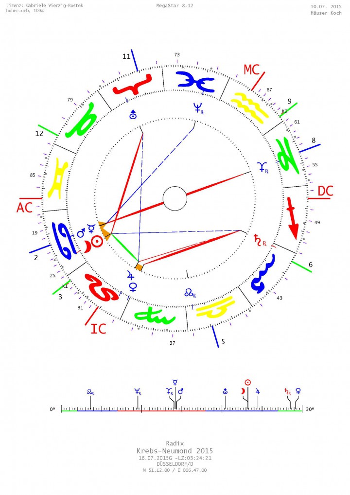Die eigene Energie ist stark, Handlungsfähigkeit besteht auch, wäre da nicht der große Widerstand von Obrigkeiten und Gesellschaft. Allerdings gemahnt diese zu Vernunft und Disziplin. Es gehört zur Autonomie dazu, sich mit klarem Verstand über Zustände zu informieren und dann Entscheidungen zu fällen, die sich langfristig auszahlen sollen. Das funktioniert nie mit reiner Emotionalität. Man muss immer die Verantwortung übernehmen. Da wir diese Haupt-Konstellation im Zeichen Krebs haben, beherrschen die Gefühle momentan jede vernünftige Erkenntnisfähigkeit. Auf der „Besitz und Substanz“-Achse bedeutet dies, sich seiner Gefühle bewusst zu sein. Aber man muss fühlen und notfalls leiden, wenn sich keine verlässliche und verbindliche Struktur findet, die Substanz sichert und in die Autonomie führt. Auf der fixen Achse werden kardinale Bestrebungen sehr genauen Prüfungen unterzogen, Sicherheit geht hier vor. Vorsicht vor Depression. Zur Lösung von Problemen sollte die andere fixe Achse: „Beziehungen und Kreativität“ beitragen, hier muss gesucht werden!