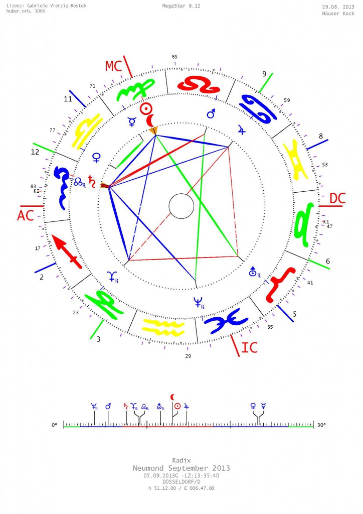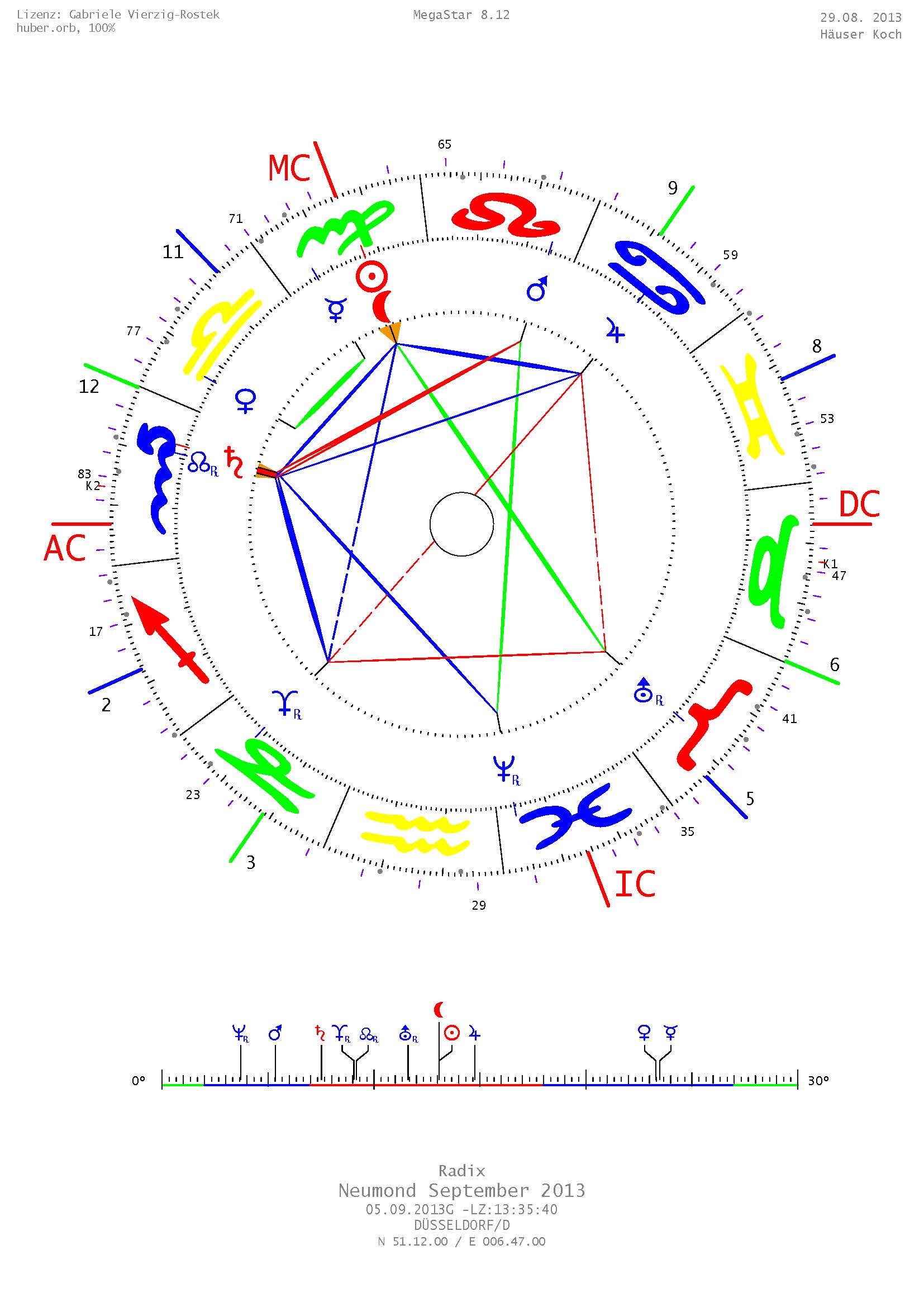 Das Fünfeck ist sehr symmetrisch, wirkt diagonal (Stabilität, Sicherheit suchend), wenn man das Sextil als Basis betrachtet und Uranus an der roten Spitze als Initiator. Hier erhält dieser auch grün von einer anderen Figur, was den Lerneffekt steigert und etwas von der Schärfe nehmen will. Denn Uranus kann zu Kurzschlussreaktionen führen, da er an der Hausspitze 5 im Instinktraum steht, wo man erst zu Rücksichtnahme durch Erfahrungen „erzogen“ wird. Ganz weg ist der Effekt nicht, die Gefahr ist noch nicht gebannt (Kriegsgefahr im nahen Osten durch Bombeneinsatz des Westens)…