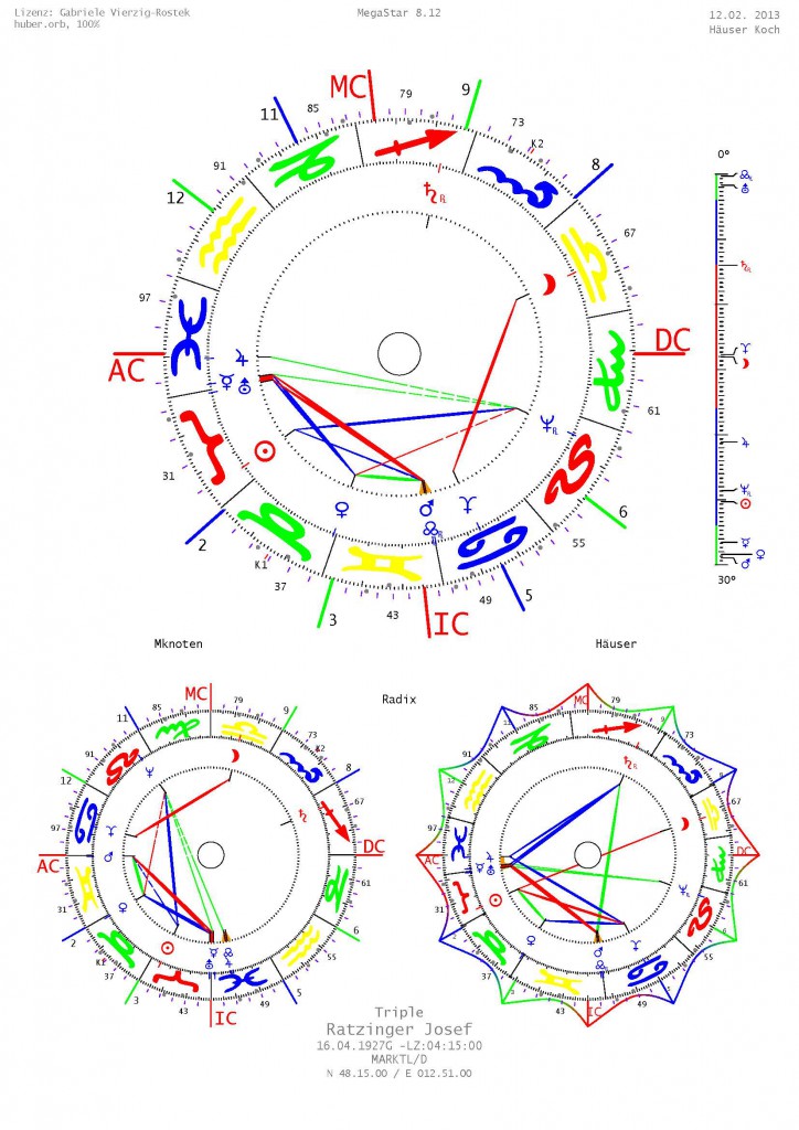 Die Opposition des Alterspunktes (exakt am 04.06.2012, jedoch wirksam seit Anfang 2011 und noch bis Anfang 2014), hat ihn die Realität erkennen und seine körperlichen Grenzen wahnehmen lassen, er zieht sozusagen die Reißleine, um nun doch noch sein Leben dem zu widmen, was im Radix steht: dem gewissenhaften Gebet und treuem Dienst am Glauben ohne die schwere Bürde des Amtes (und seiner Kleidung), als einfacher Gläubiger im Herzen des Vatikan behütet, aber ohne die prunkvolle Ausrüstung, das ist sicher leichter…