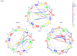 Diesmal zeige ich auch zum Neumond Horoskop das Triple weil es mir wichtig ist, zu zeigen, dass das Häuser Horoskop sich stark energetisch von der Radix unterscheidet.