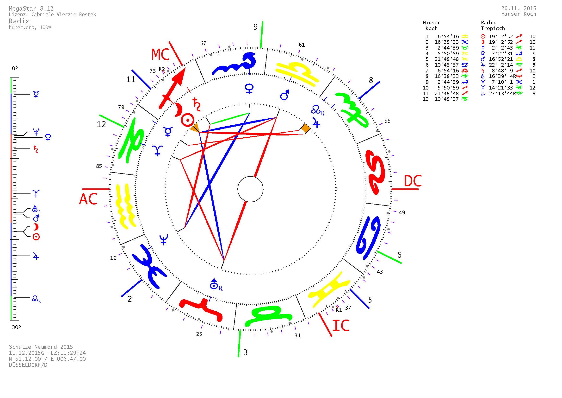 Saturn ist mit Venus und Neptun in einem unaspektierten Lerndreieck und hier stellt die einzige grüne Linie die Aufgabe, sich zu informieren, die weiblichen Anteile in der Tiefe zu akzeptieren und daraus zu lernen, was evtl. mit Hilfe von Spiritualität durch Meditation erfahren wird. Diese Inhalte werden im Gedächtnis zu einer Änderung der Lebenseinstellung führen, wenn die entsprechende Reife da ist. Die weise Frau in uns kann ihre Kraft (wieder?) finden, sie nimmt ihre Erfahrungen aus der Tiefe des kollektiven Unbewussten (gemeint ist das höhere Unbewusste) mit ins Hier und Jetzt und nutzt sie dankbar als Chance für die weitere Entwicklung. Wobei der Moment des Innehaltens hier wichtig ist, um aus der Ruhe die Kraft zu schöpfen und dann das Ergebnis oder die gewonnene Erkenntnis zielführend zu verinnerlichen, damit eine neue Wegrichtung anvisiert werden kann: „Ich sehe ein Ziel und -nach Erreichen- ein neues Ziel“. Schütze Energie ist Feuer: spontan, voller Ideale und Erneuerung aus sich selbst heraus aufgeschlossen.