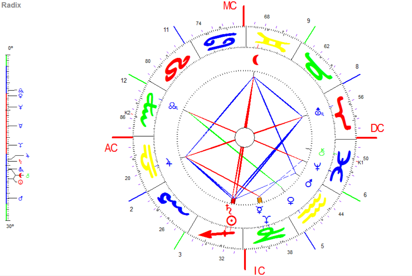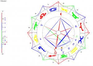Im Häuser-Horoskop ist Mars stärker eingebunden, also sind die Außenauftritte stärker, als die innere Konstitution anbietet, dafür zeigt sich die Disziplin (Pluto) schwächer.