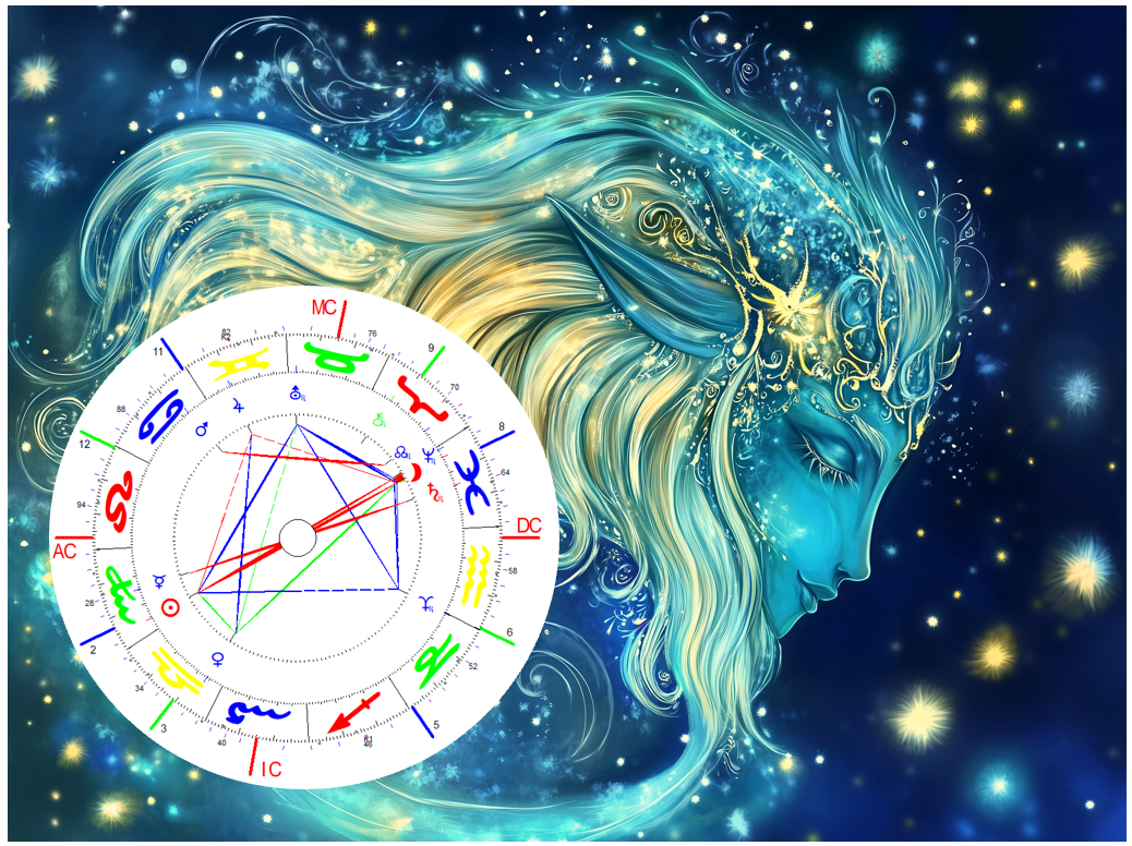 Sonne-Mond mit Jupiter und Venus. Weiblicher Kampf um Gerechtigkeit und Aufmerksamkeit, sowie allgemein Wohlstand und Wohlbefinden. Auswahl möglich?
