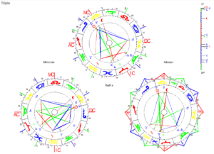 Sonne im Tal-Punkt von Haus 10 scheint sich um Befindlichkeiten und Wohlstand zu kümmern, was wenig Resonanz bekommt, da Venus nah bei ihr steht. Beide sind in ein dominantes Erkenntnis Dreieck mit Pluto und Mars eingebunden. Da Pluto sich zuerst einmischt, kann die Tatkraft von Mars gewissenhaft ausfallen. Immerhin steht Mars in Haus 7 und kümmert sich um Mitmenschen im allgemeinen und Partner im besonderen.