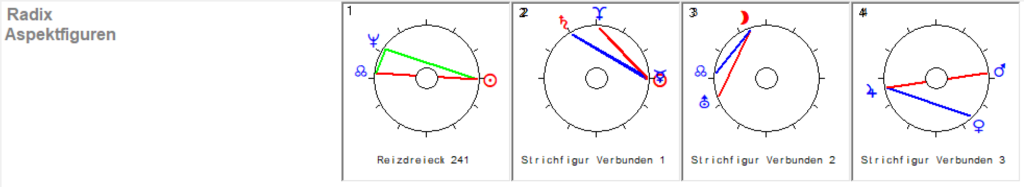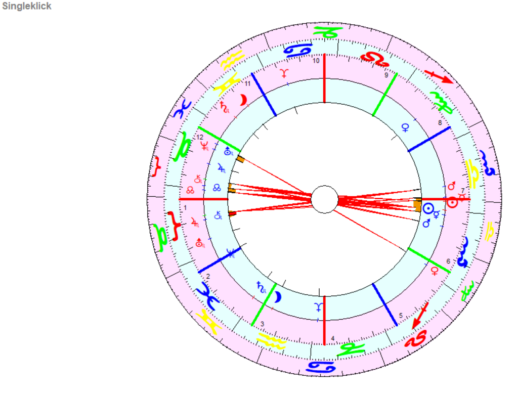 Aufschlussreich zeigt sich das Single Klick Horoskop, es kombiniert Radix mit Mondknoten Horoskop und hier werden nur Oppositionen und Konjunktionen berücksichtigt.