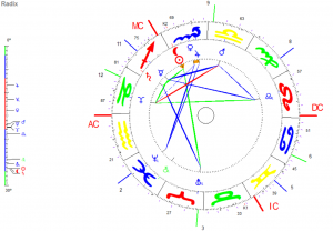 Die Sonne-Mond-Konjunktion in einer losgelösten Suchfigur mit Saturn und Uranus an der Spitze zeigt das wache Bewusstsein, einen Neuanfang in festgefahrener Kommunikation finden zu wollen. Sicherheit und gleichzeitig Autonomie sind Bestrebungen, die manchmal nicht über Nacht zu finden sind.