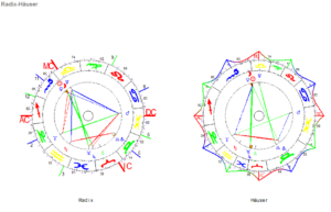 Die ICH Planeten Sonne und Mond stehen am Tal-Punkt Haus 10. Öffentlichkeit, Disziplin, Autorität und Autonomie sind hier gewünscht. Venus hat dabei eigene Vorstellungen von Harmonie im Zeichen Skorpion. Allerdings richtet sich die Botschaft hauptsächlich nach Innen.
