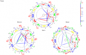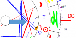 (Erklärung der Autorin: „Gekreuzte Schwerter“ sind zwei Quadrate, die sich schneiden. Dort sind konzentrierte Konflikte enthalten. Sucht man den Ort, wo sie sich entladen, zieht man vom Mittelpunkt der Radix durch den Schnittpunkt der beiden Quadrate eine Linie. So kommt man genau am Ort an, hier der DC).