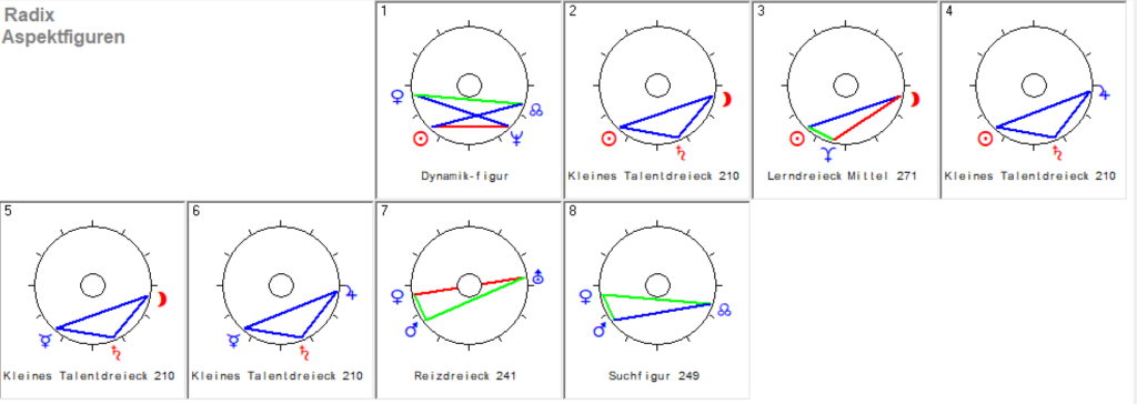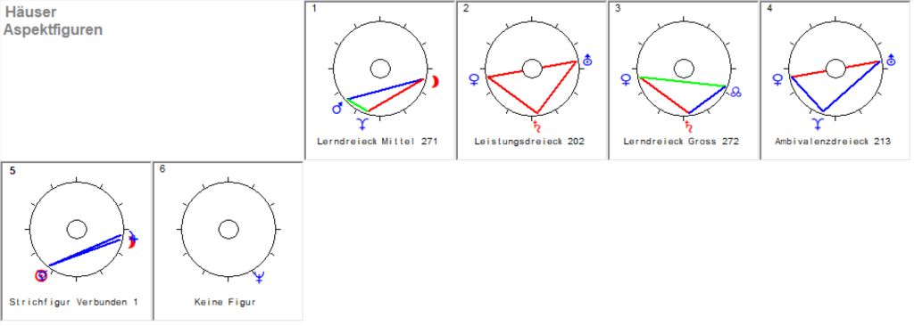 Diese Figur aus Venus-Mars und Mondknoten ist eine Aufforderung. Existenzkampf im Alltag? Ein Schritt nach dem anderen in Vernunft? Hier ist die Gelegenheit, spontan hervorzutreten und Entscheidungen zu fällen, die sinnvoll sind. Anstatt um den heißen Brei herum keine Entscheidungen zu fällen… Die Figur zeigt eine Neigung zum Ausweichen an.
