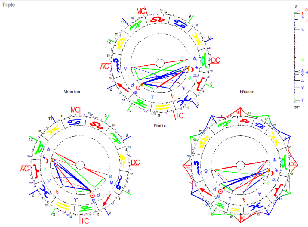Im Mondknoten-Horoskop liegen die Persönlichkeits-Planeten an Tal Punkten sehr introvertiert und ohne Einfluss. Venus Mars Uranus im Reizdreieck haben großes Leid erfahren, bis hin zu Vernichtung, was heute noch/wieder triggert. Unser Unbewusstes kennt das alles schon.
