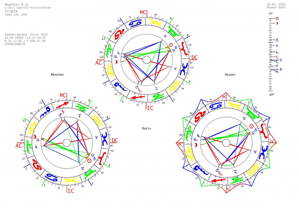 Dieser Stier Monat kann viel durch Kontakte und Kommunikation erreichen! Das veränderlich-kardinale Aspektbild liegt auf dem 2. Strahl (Liebe und Weisheit). Die vielen großen Dreiecke zeigen Kommunikationsbereitschaft und Zuwendung zum Anderen, um Probleme durch gründliches Hinterfragen zu lösen. Liebe und Kontakt sowie Kreativität spielen dabei eine große Rolle.