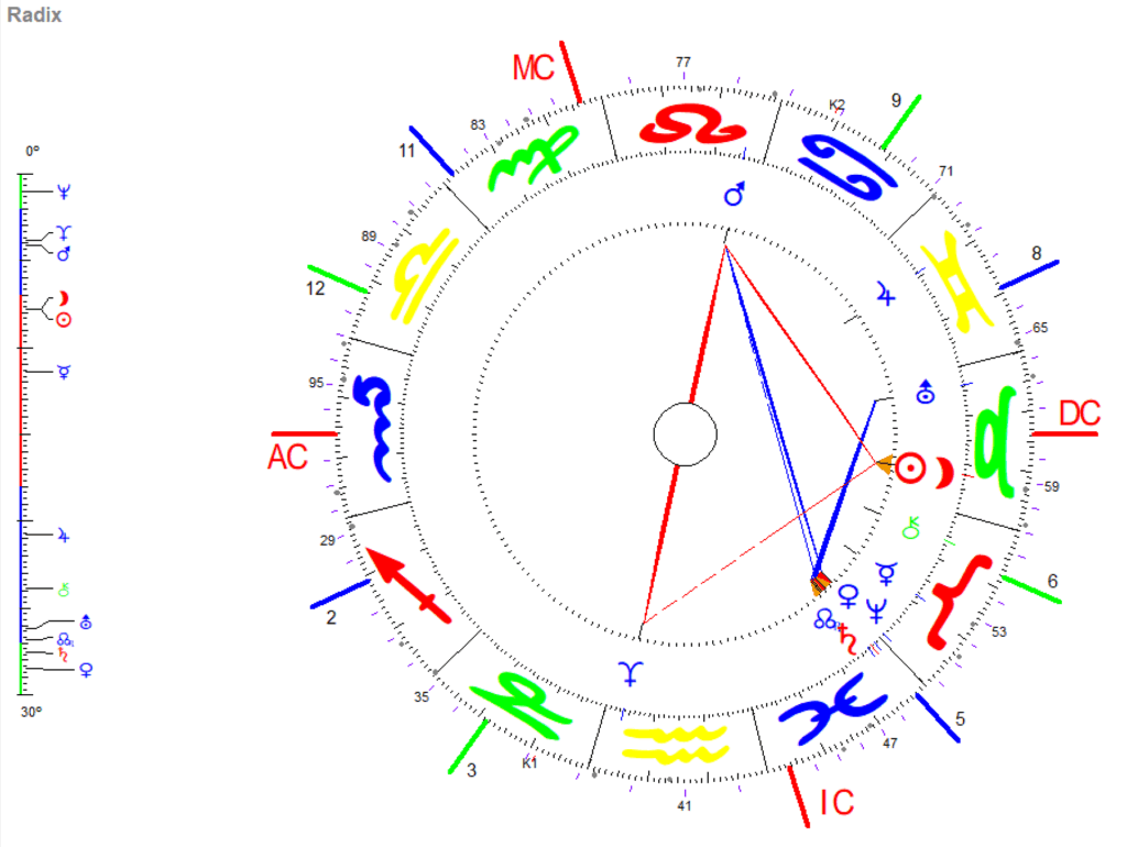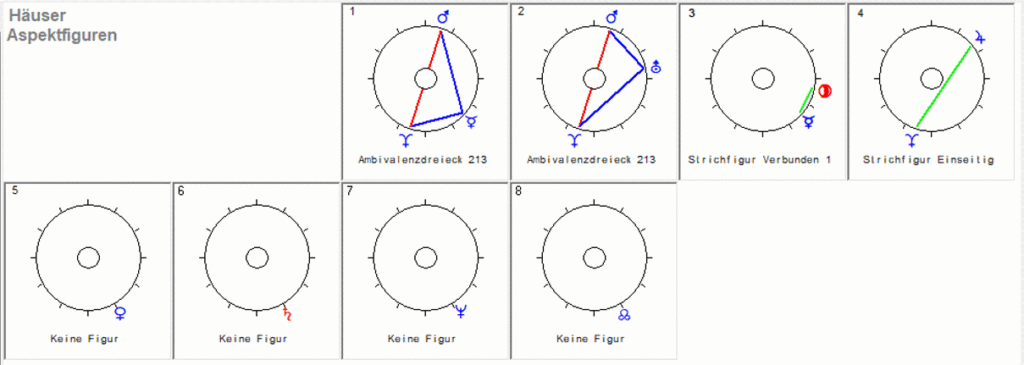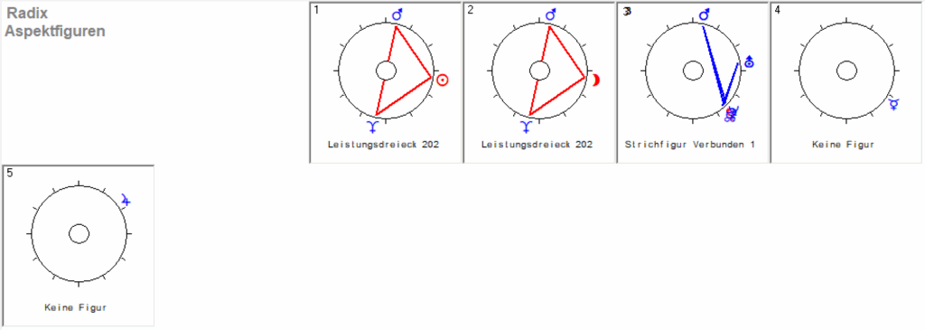 Das Leistungsdreieck Sonne/Mond-Pluto-Mars steht eingeschlossen bzw. am Tal-Punkt und erzeugt den erwähnten inneren Druck, der sich auf die Existenzgrundlage, kollektives Denken und individuelles Handeln bezieht.
